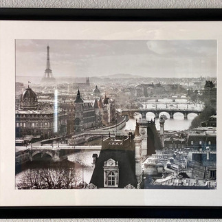 Upholstered Panel Headboard & Queen Size Bed ($750.00), Belham Living Gray Hutton Arched Cube Nailhead Ottoman ($45.00), Paris Siene River ($60.00), Valentine Prinsep ($45.00), Floral Arrangement ($30.00), Hobby Lobby Black & White Wall Decor ($30.00).